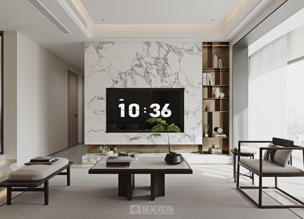 这款空间走现代轻奢设计路线,以大理石为主材打造电视与沙发背景墙,自然的纹理赋予空间高级质感。整体以白色调为基底,搭配浅色系软装与木质家具,柔化石材的冷硬感。大面窗景引入充足自然光,让空间更显通透开阔,简约的线条与精致的材质结合,营造出兼具格调与舒适的家居氛围。
