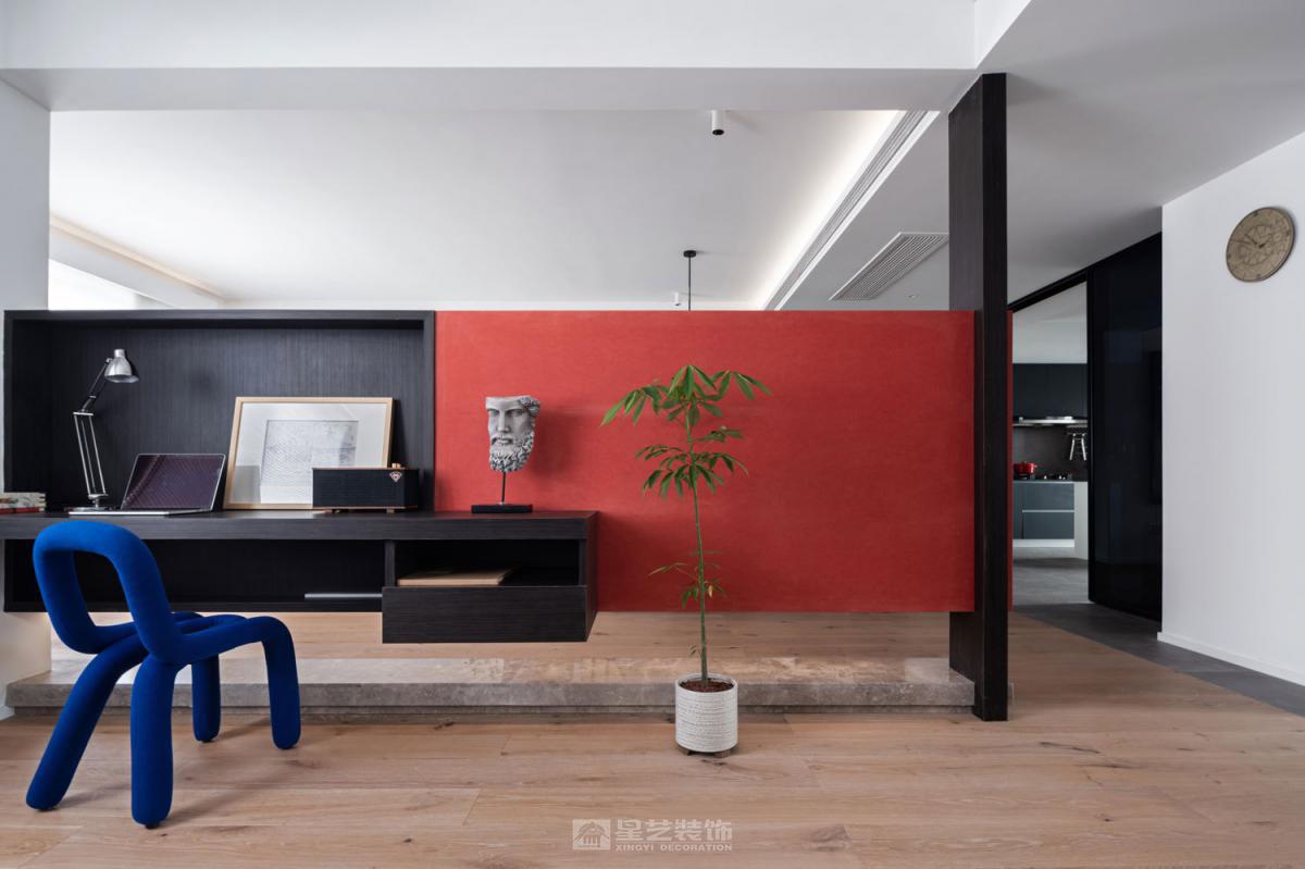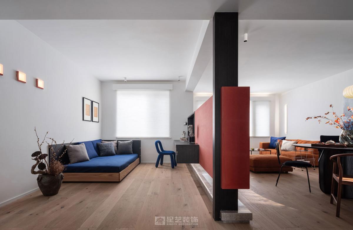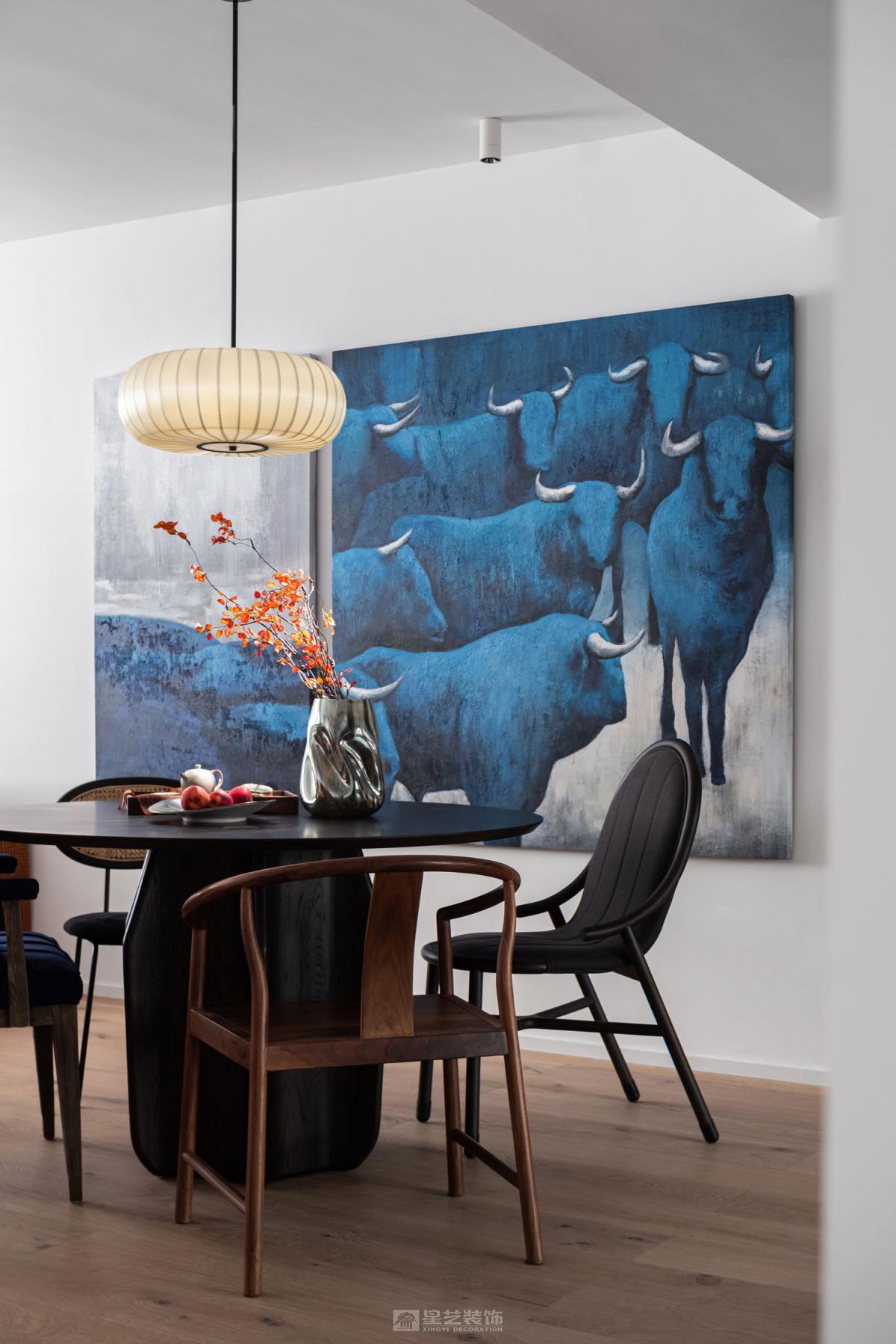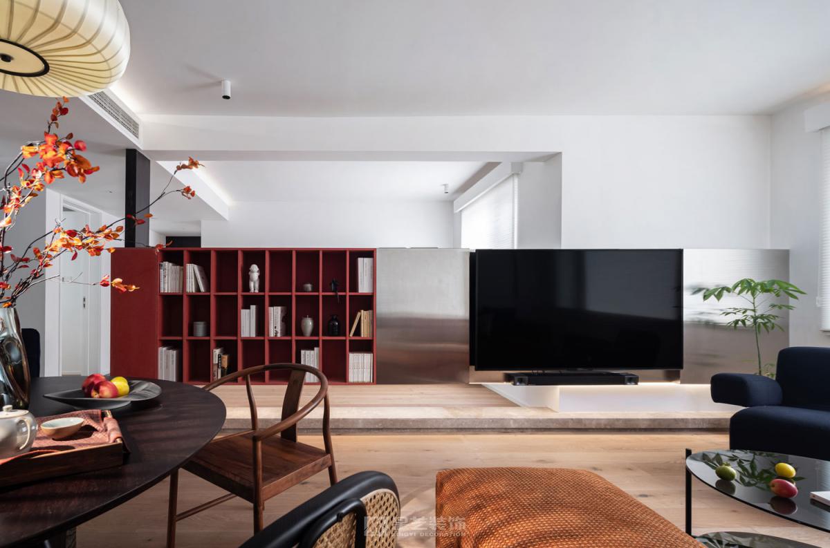 1. 色彩搭配:克制中见层次 主色调:以黑、白、灰、浅木色为主,营造干净、通透的基底。例如,白色墙面、灰色地砖、浅木地板。 点缀色:局部使用高饱和度色彩(如红色书架、蓝色椅子、橙色花卉)打破单调,形成视觉焦点,同时呼应中式美学中“点睛之笔”的哲学。 自然色系:通过绿植、枯枝、水果等自然元素的色彩,为空间注入生机与温度。 2. 材质选择:现代与自然的碰撞 现代材质:黑色金属(茶几、桌腿)、玻璃(隔断、桌面)、哑光烤漆板(橱柜)、不锈钢(厨具),体现工业设计的精致感。 自然材质:实木(餐桌、椅子、地板)、棉麻(抱枕、床品)、藤编(收纳篮)、陶瓷(茶具、花瓶),保留材质的原始肌理,增添质朴感。 材质对比:如黑色金属与浅木色的冷暖对比、玻璃与实木的虚实结合,强化空间的层次感。 3. 家具与布局:简约线条与中式意境的结合 家具造型:线条简洁利落(如黑色细腿茶几、现代餐椅),同时融入中式元素(如圆形餐桌象征“团圆”,灯笼吊灯体现传统韵味)。 空间布局:开放式设计(如厨房与餐厅连通)增强通透感,局部通过隔断(如红色书架、黑色立柱)划分功能区域,实现“隔而不断”的中式空间哲学。 功能性优先:嵌入式电器节省空间,开放式书架兼顾收纳与展示,岛台设计提升厨房互动性。 4. 软装与细节:东方美学的现代演绎 装饰品:抽象艺术画(如蓝色公牛画作)、枯枝插花、传统茶具、红色书架,既有现代艺术的张力,又蕴含中式“留白”与“写意”的意境。 灯光设计:线性灯带、筒灯提供基础照明,局部通过吊灯(如白色灯笼形吊灯)、台灯营造氛围,光影层次丰富且柔和。 自然元素:绿植(盆栽、枯枝)、水果(餐桌上的果盘)、花卉(橙色花束),强调与自然的连接,符合中式“天人合一”的理念。