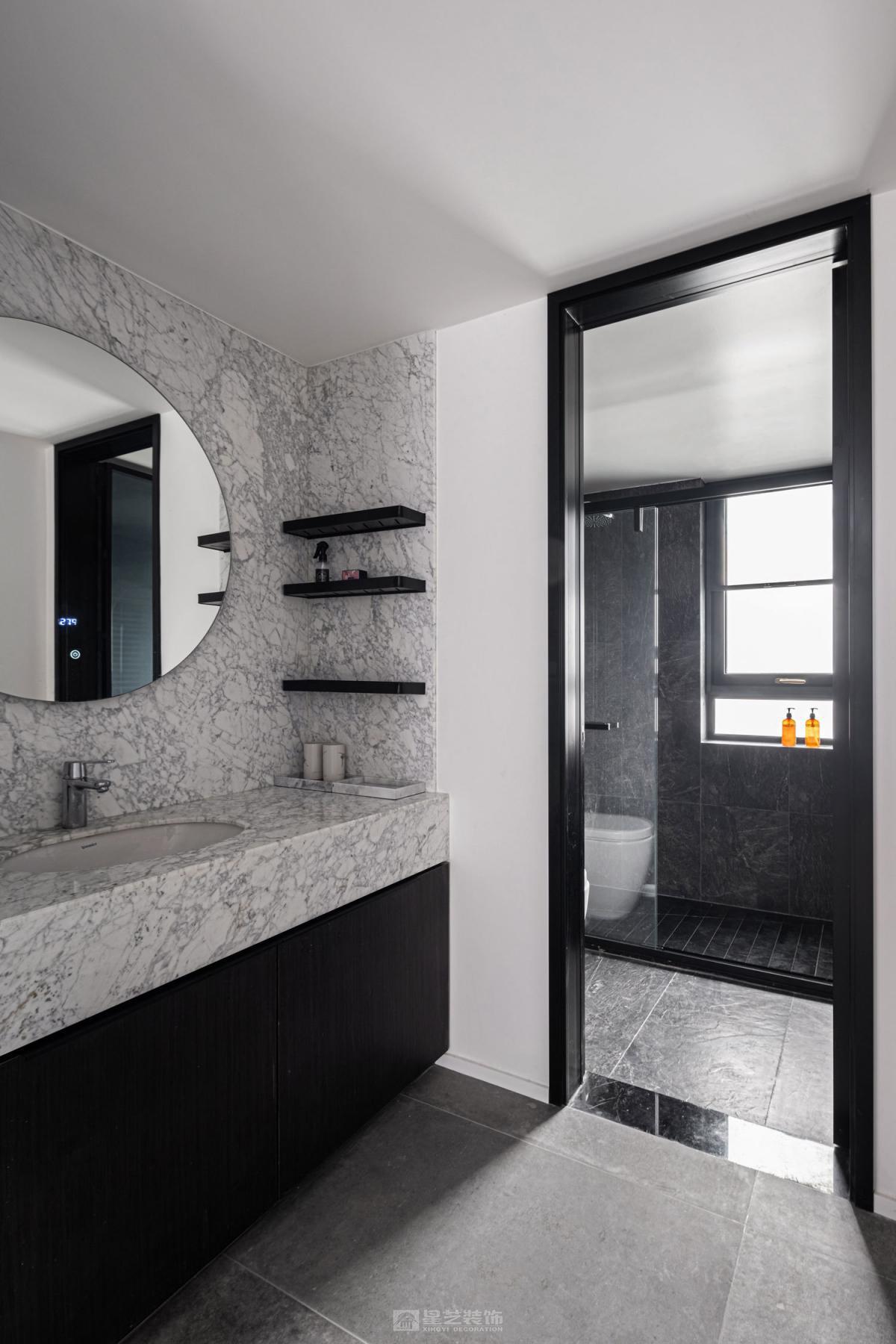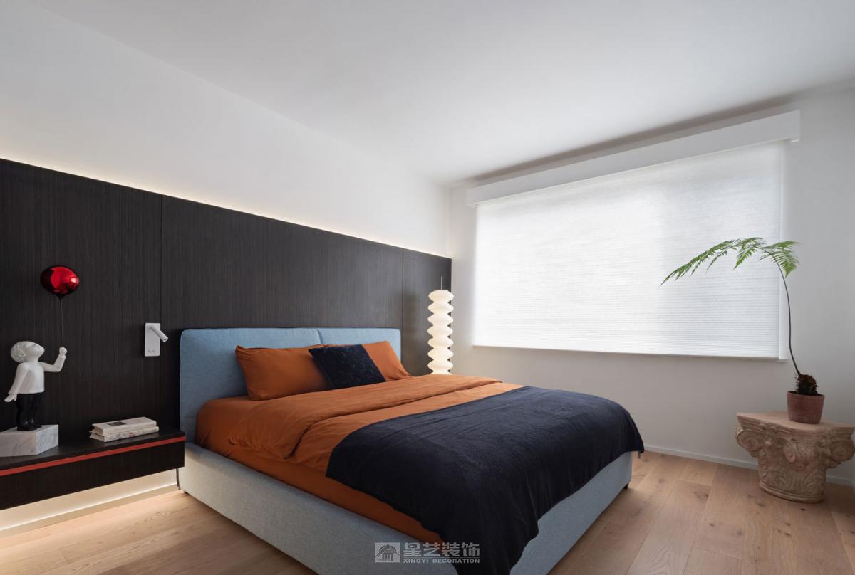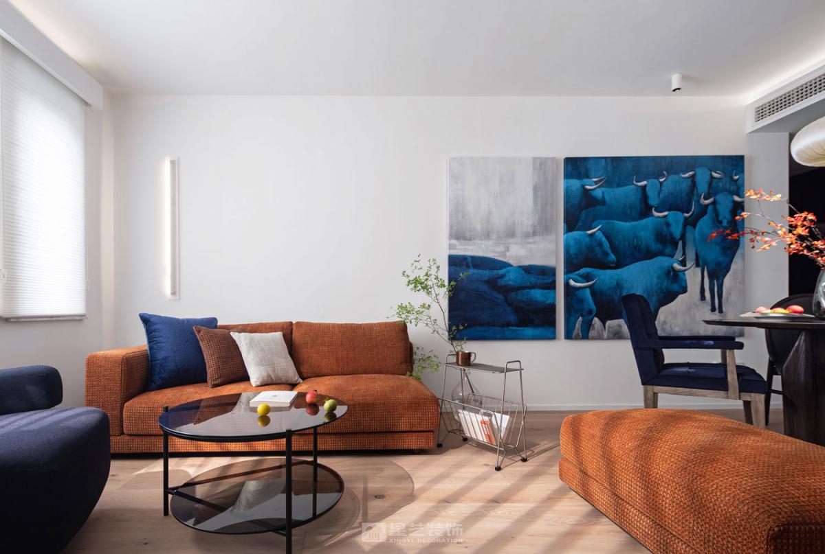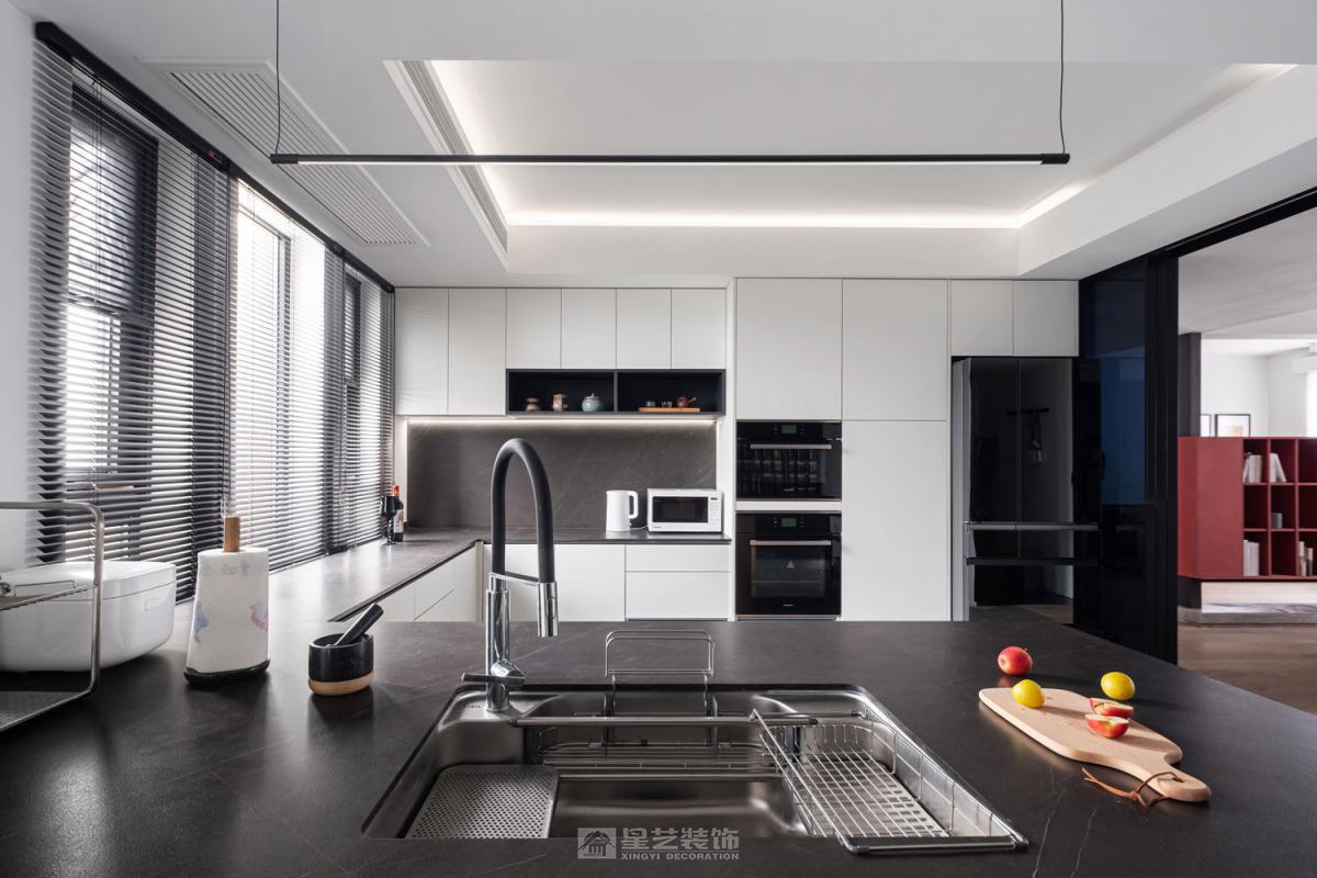1. 色彩搭配:克制中见层次 主色调:以黑、白、灰、浅木色为主,营造干净、通透的基底。例如,白色墙面、灰色地砖、浅木地板。 点缀色:局部使用高饱和度色彩(如红色书架、蓝色椅子、橙色花卉)打破单调,形成视觉焦点,同时呼应中式美学中“点睛之笔”的哲学。 自然色系:通过绿植、枯枝、水果等自然元素的色彩,为空间注入生机与温度。 2. 材质选择:现代与自然的碰撞 现代材质:黑色金属(茶几、桌腿)、玻璃(隔断、桌面)、哑光烤漆板(橱柜)、不锈钢(厨具),体现工业设计的精致感。 自然材质:实木(餐桌、椅子、地板)、棉麻(抱枕、床品)、藤编(收纳篮)、陶瓷(茶具、花瓶),保留材质的原始肌理,增添质朴感。 材质对比:如黑色金属与浅木色的冷暖对比、玻璃与实木的虚实结合,强化空间的层次感。 3. 家具与布局:简约线条与中式意境的结合 家具造型:线条简洁利落(如黑色细腿茶几、现代餐椅),同时融入中式元素(如圆形餐桌象征“团圆”,灯笼吊灯体现传统韵味)。 空间布局:开放式设计(如厨房与餐厅连通)增强通透感,局部通过隔断(如红色书架、黑色立柱)划分功能区域,实现“隔而不断”的中式空间哲学。 功能性优先:嵌入式电器节省空间,开放式书架兼顾收纳与展示,岛台设计提升厨房互动性。 4. 软装与细节:东方美学的现代演绎 装饰品:抽象艺术画(如蓝色公牛画作)、枯枝插花、传统茶具、红色书架,既有现代艺术的张力,又蕴含中式“留白”与“写意”的意境。 灯光设计:线性灯带、筒灯提供基础照明,局部通过吊灯(如白色灯笼形吊灯)、台灯营造氛围,光影层次丰富且柔和。 自然元素:绿植(盆栽、枯枝)、水果(餐桌上的果盘)、花卉(橙色花束),强调与自然的连接,符合中式“天人合一”的理念。