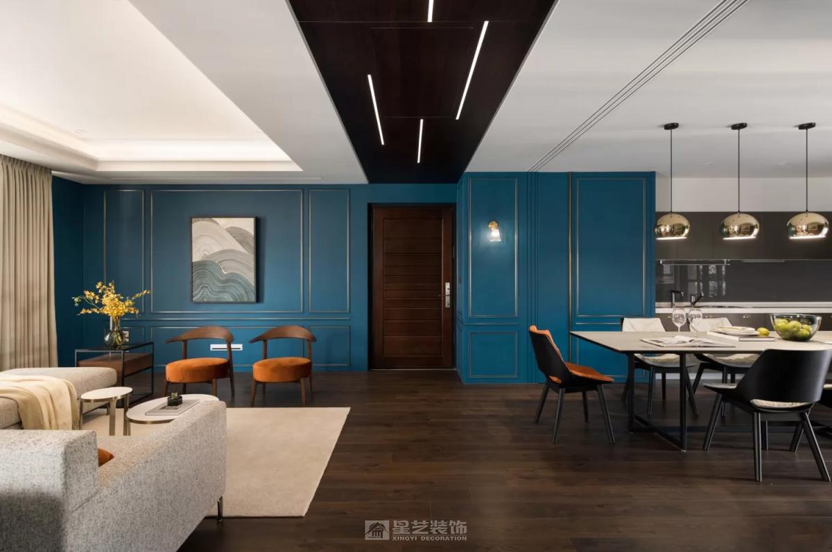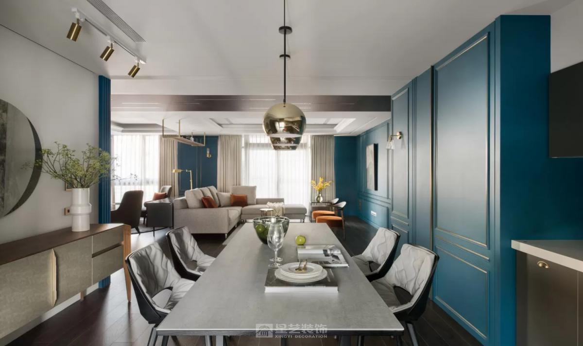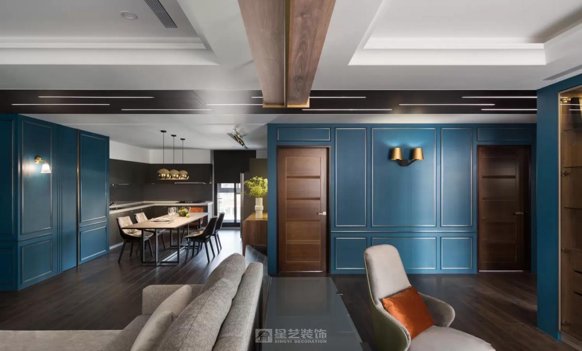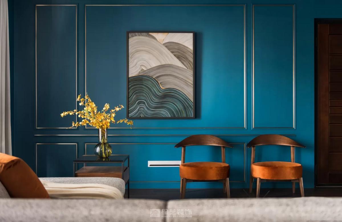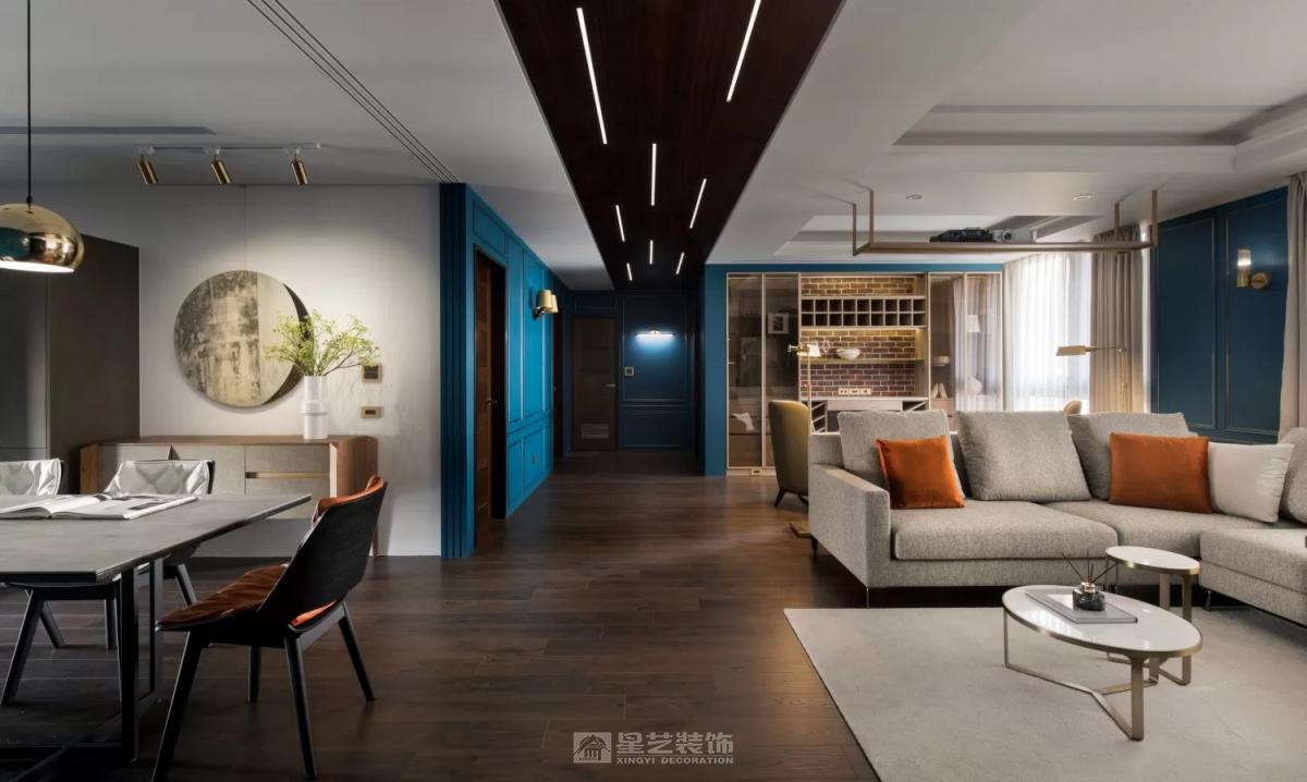 英伦绅士蓝风格以蓝色系为主色调,通过不同深浅的蓝色营造层次感。主色调通常选用皇家蓝、深蓝色、海军蓝等沉稳色调,搭配灰色、白色作为辅助色,再以金属色、木本色进行点缀,增添精致感。这种配色方案既能体现绅士的稳重气质,又不会显得过于沉闷。 在具体应用中,墙面常采用深蓝色护墙板或墙漆,搭配白色或浅灰色天花,形成经典对比。软装方面,蓝色沙发、地毯与米色、灰色单品相得益彰,局部点缀橙色、酒红色等暖色调,为空间注入活力