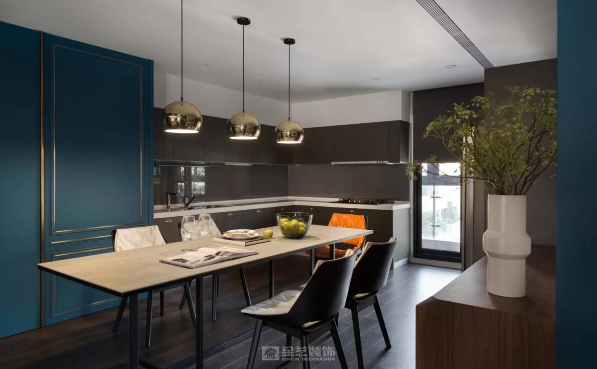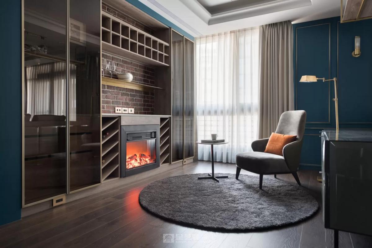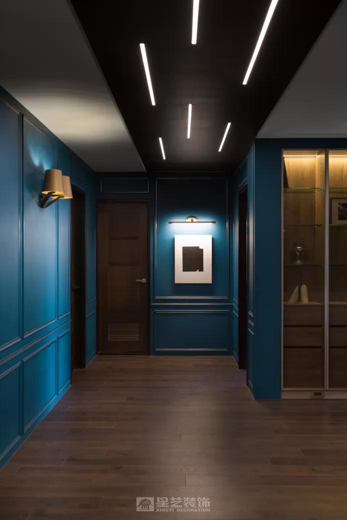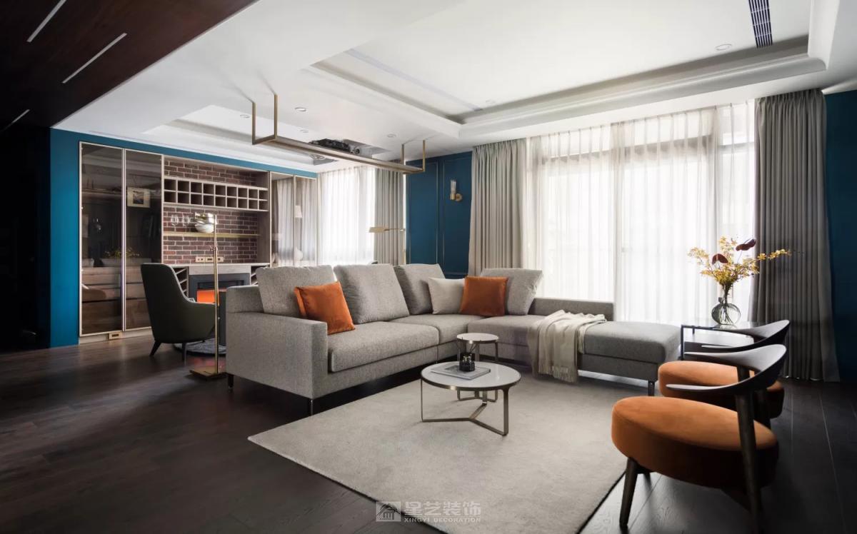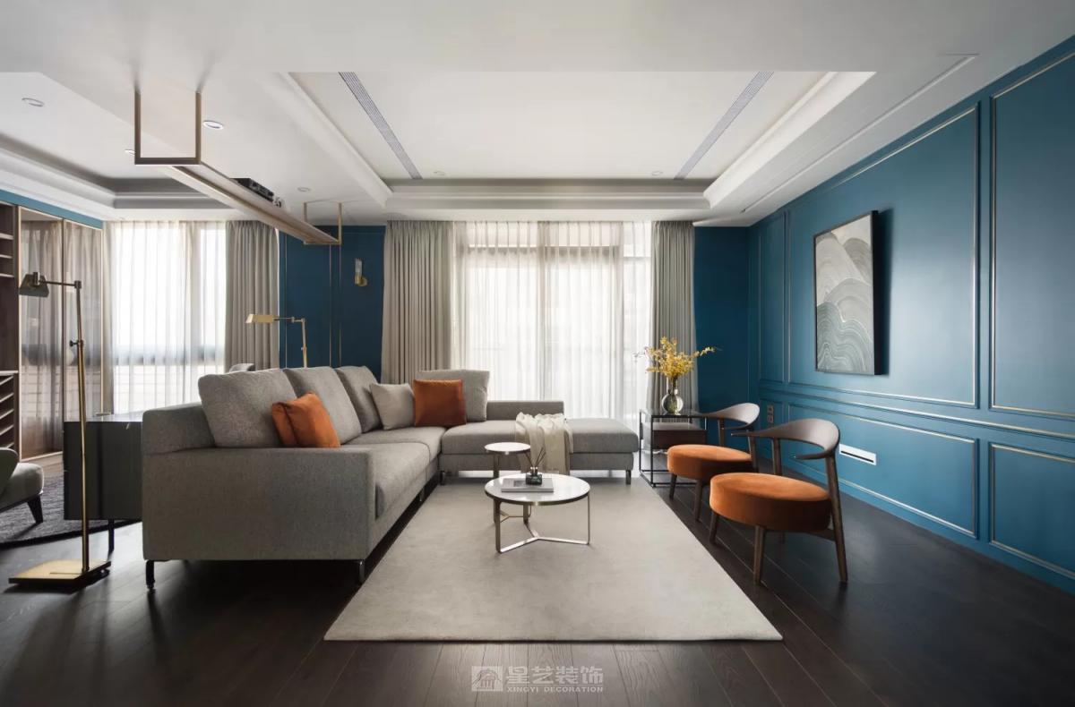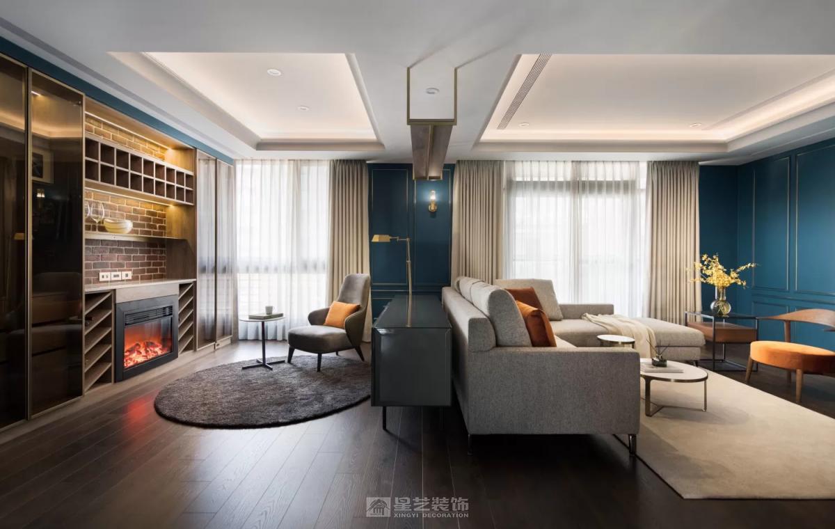 英伦绅士蓝风格以蓝色系为主色调,通过不同深浅的蓝色营造层次感。主色调通常选用皇家蓝、深蓝色、海军蓝等沉稳色调,搭配灰色、白色作为辅助色,再以金属色、木本色进行点缀,增添精致感。这种配色方案既能体现绅士的稳重气质,又不会显得过于沉闷。 在具体应用中,墙面常采用深蓝色护墙板或墙漆,搭配白色或浅灰色天花,形成经典对比。软装方面,蓝色沙发、地毯与米色、灰色单品相得益彰,局部点缀橙色、酒红色等暖色调,为空间注入活力