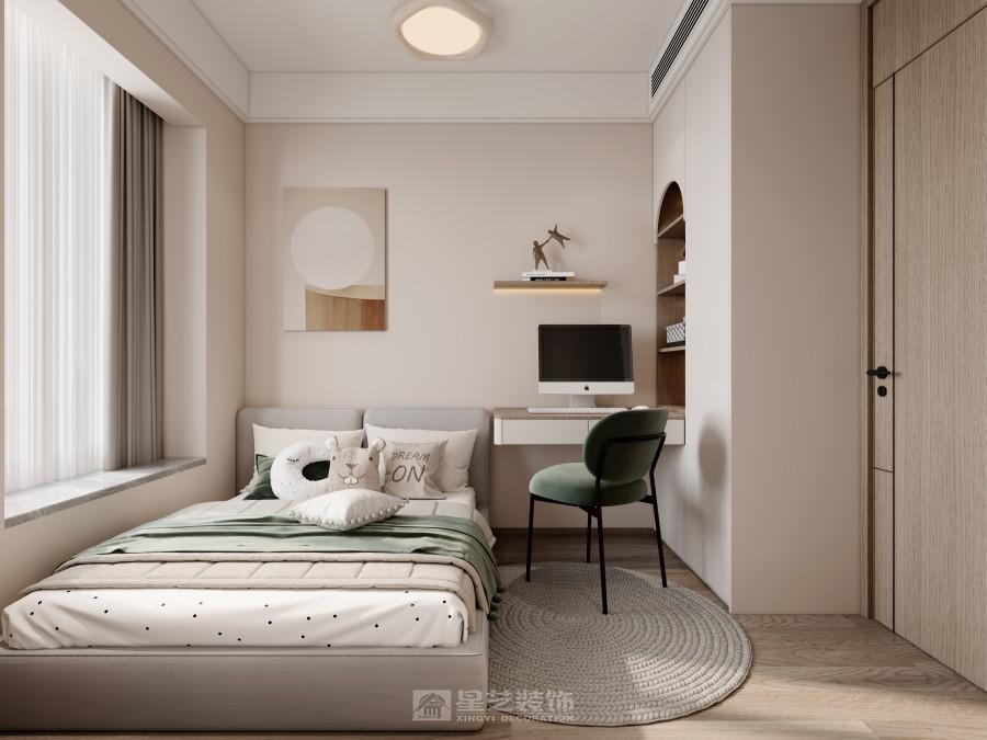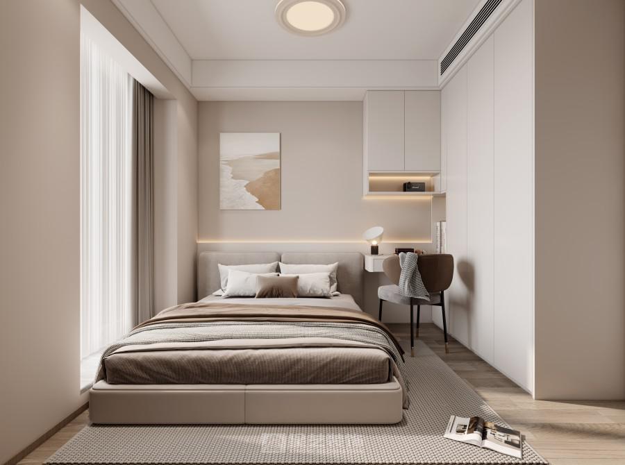 以“暖调轻简的休憩私域” 为核心:用浅棕 + 柔白的低饱和色调铺陈松弛氛围,一体化柜体整合收纳与轻办公功能,消弭小户型局促感。柔光墙与纱帘引自然光漫入,肌理床品与艺术挂画柔化空间棱角,金属脚椅点缀精致质感。设计以 “功能隐形 + 暖质包裹” 为思路,在有限尺度里,让卧室兼具休憩的温柔与实用的便捷,成为都市里可舒展身心的静谧角落。