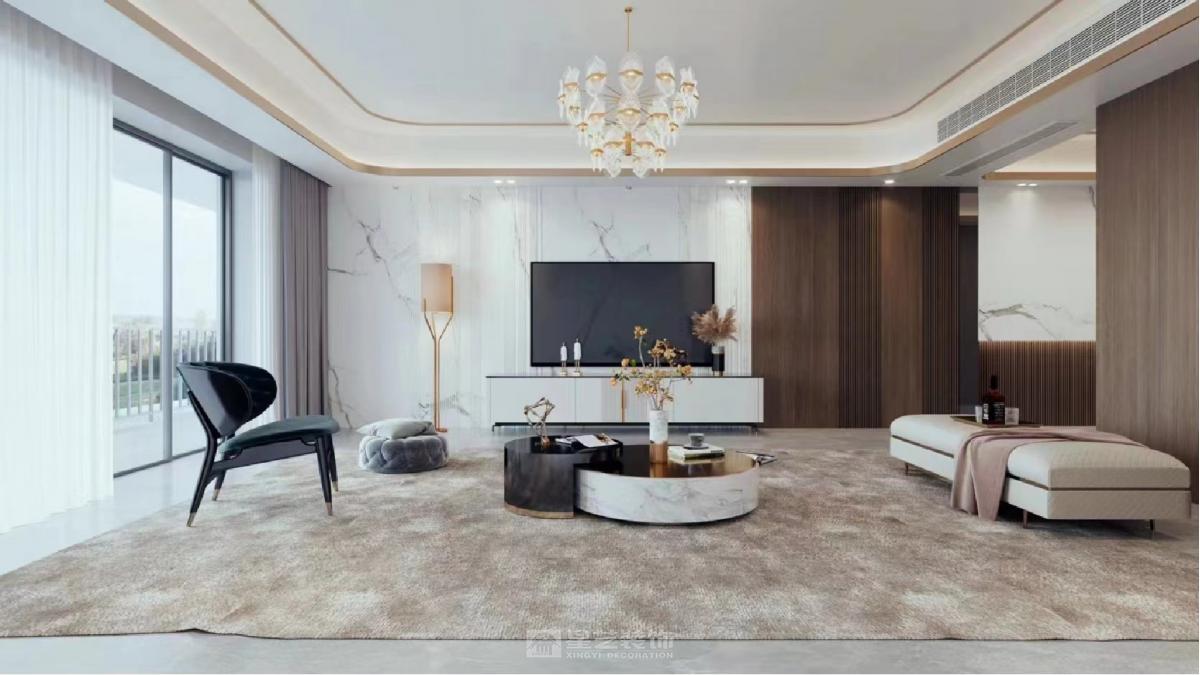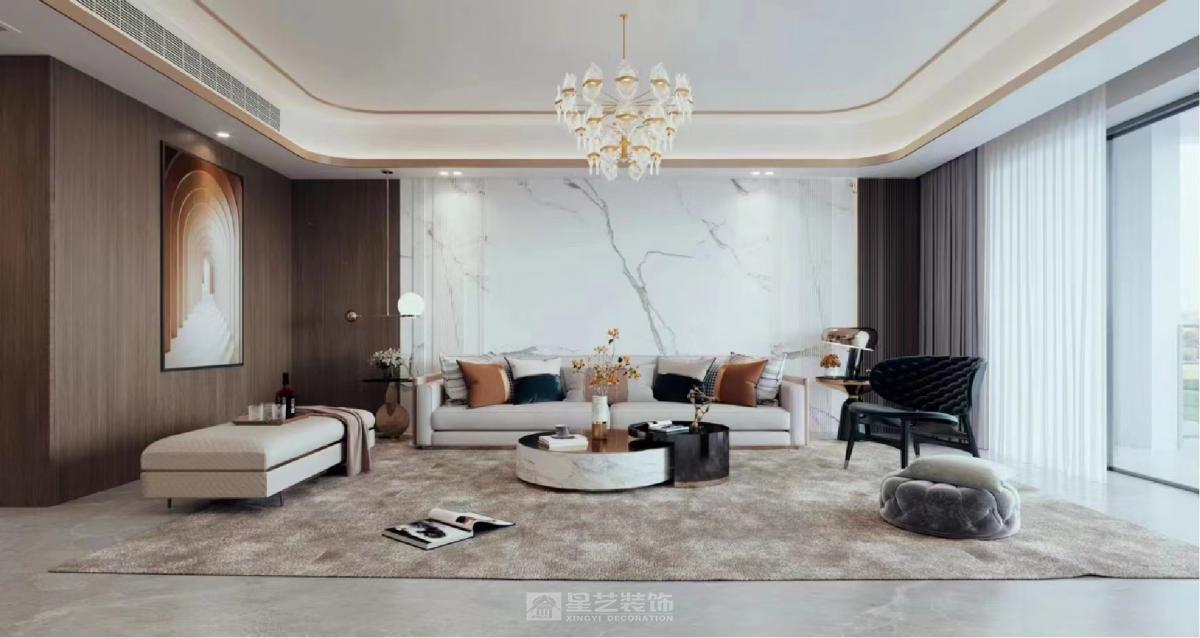 本案现代轻奢空间,以岩板和饰面板为核心主材,运用其石纹文理和木纹质感,搭配金属线条、柔光材质,打造地面、台面及背景墙核心视觉。整体色调雅致高级,线条利落精致,岩板的质感与轻奢元素相融,营造精致舒适的现代家居氛围。