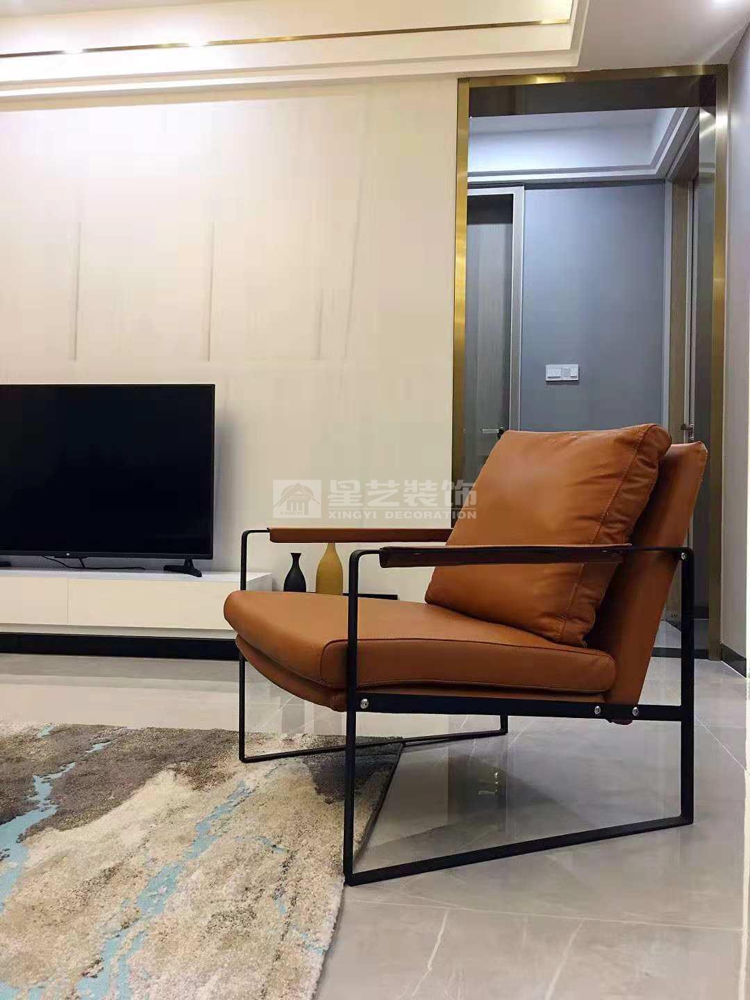 采用了长方形地砖直铺体现空间块面感,电视背景运用哑光素色砖点缀,墙体采用大面积灰色调营造空间氛围与电视背景白色系对比,整体简洁大方,细微处见生活品质。