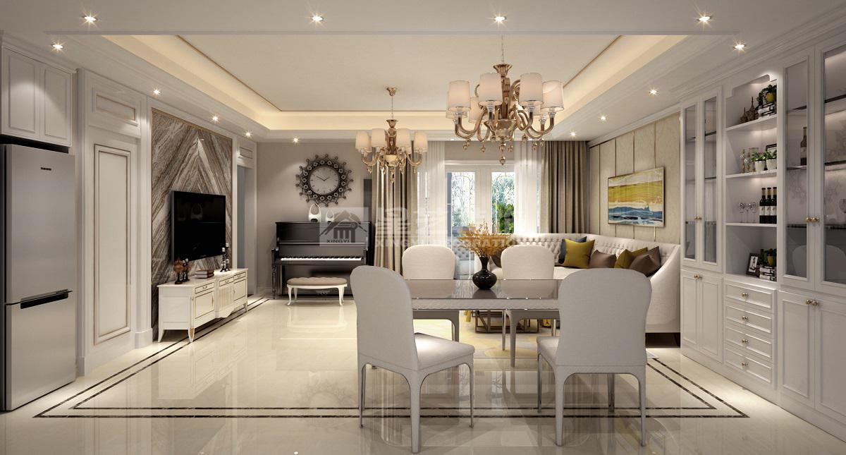 简欧风格的核心是去繁就简,留下简单的线条和几何图案。地毯的图案相对繁琐与各家具的相对简洁 形成了鲜明的对比,使之简洁而又不失趣味。金色加白色吊灯看起来则相对奢华一些,与电视背景的造型的相互陪衬,予人现代感而又高贵得体。吊顶和背景墙的方形设计,它在空间中脱颖而出,同时色调又统一于整个空间使之在欧式风格中不显突兀。