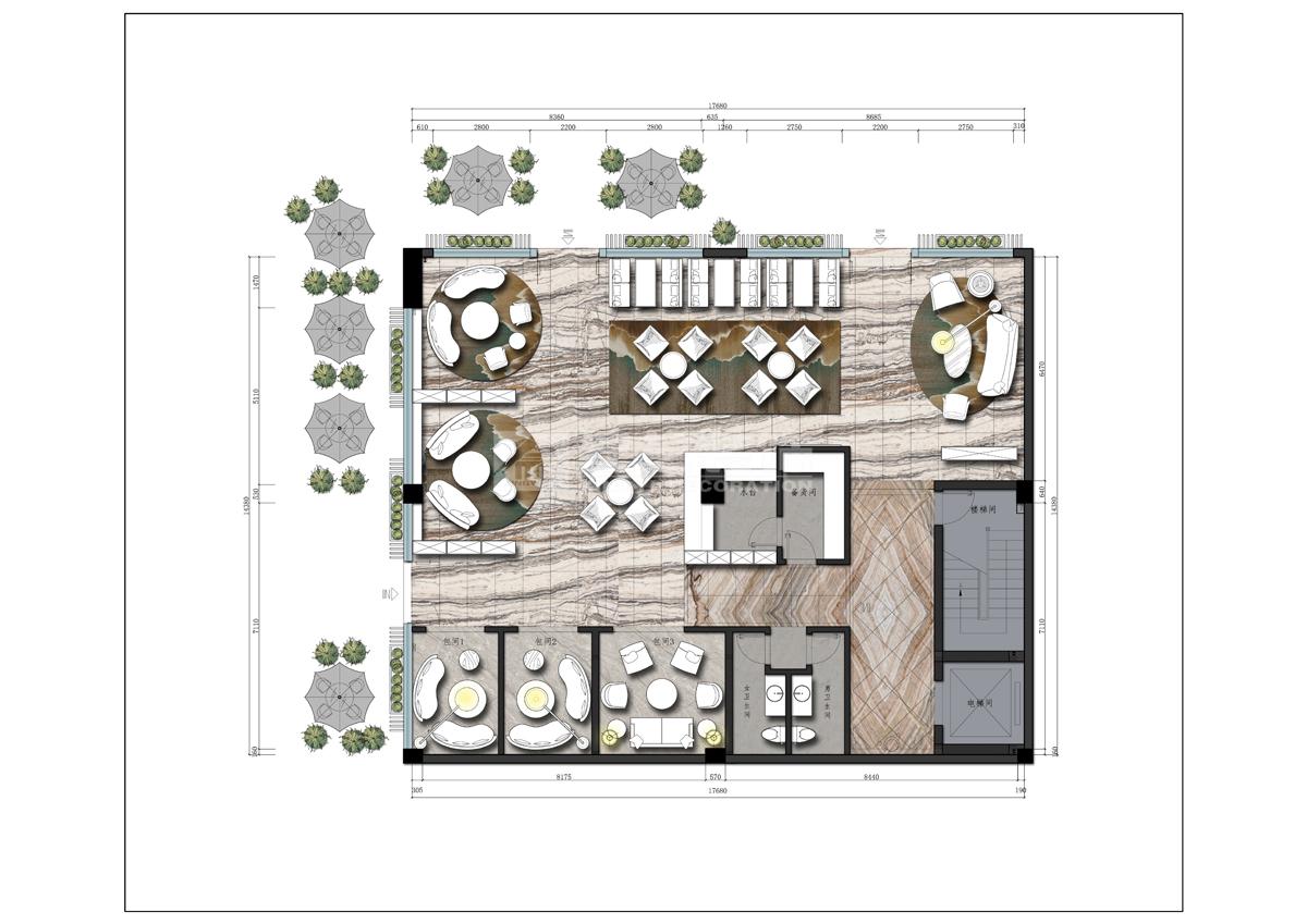本案为一商业空间,一层为休闲咖啡厅,二层为餐厅加盟招商中心,三层为美容SPA,四层为会议室,五层为KTV包箱,是一个综合性质的会所,主要是供内部及商业伙伴使用。