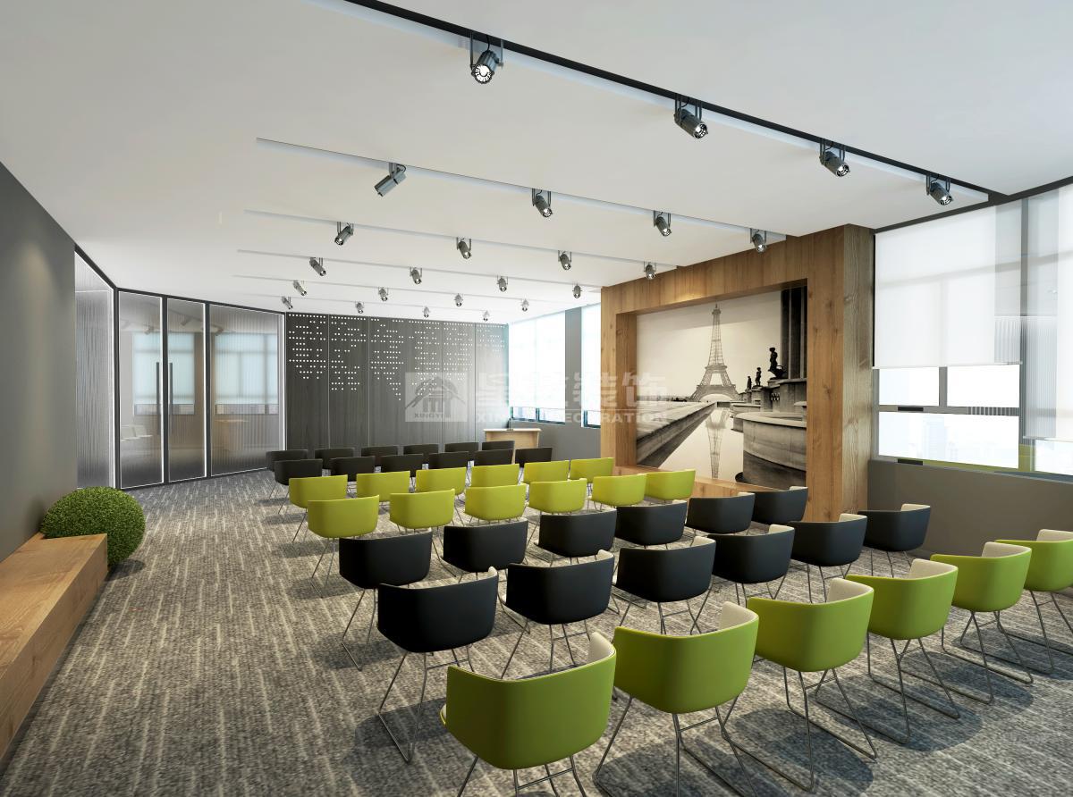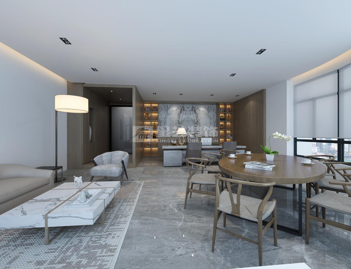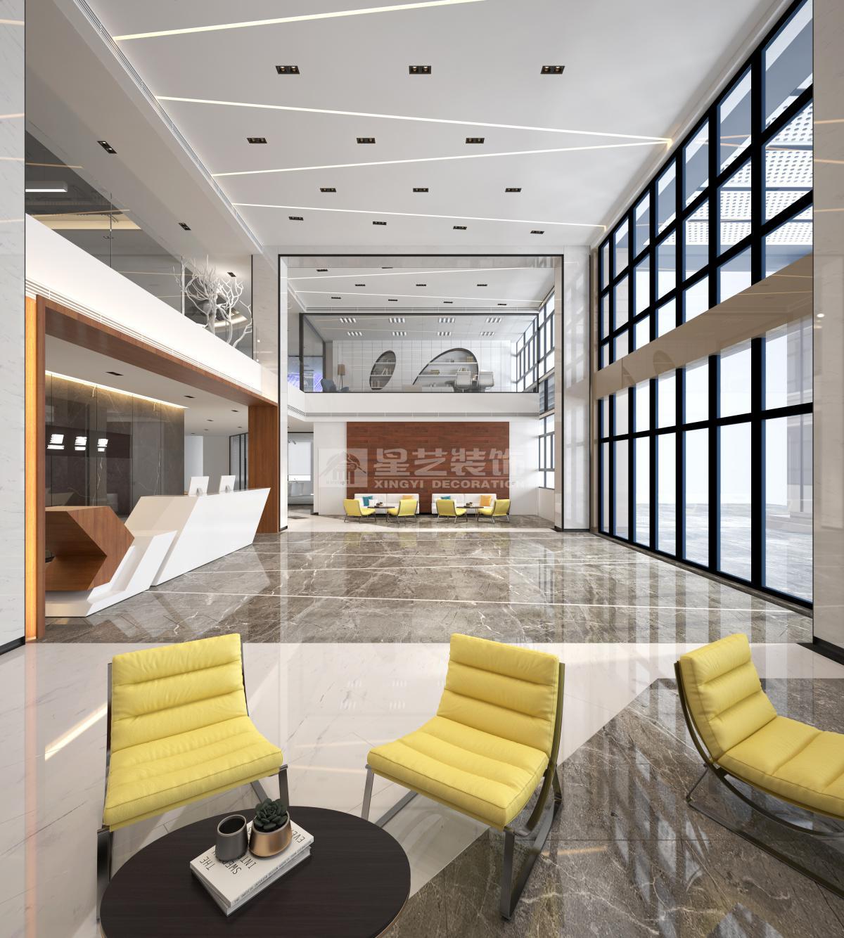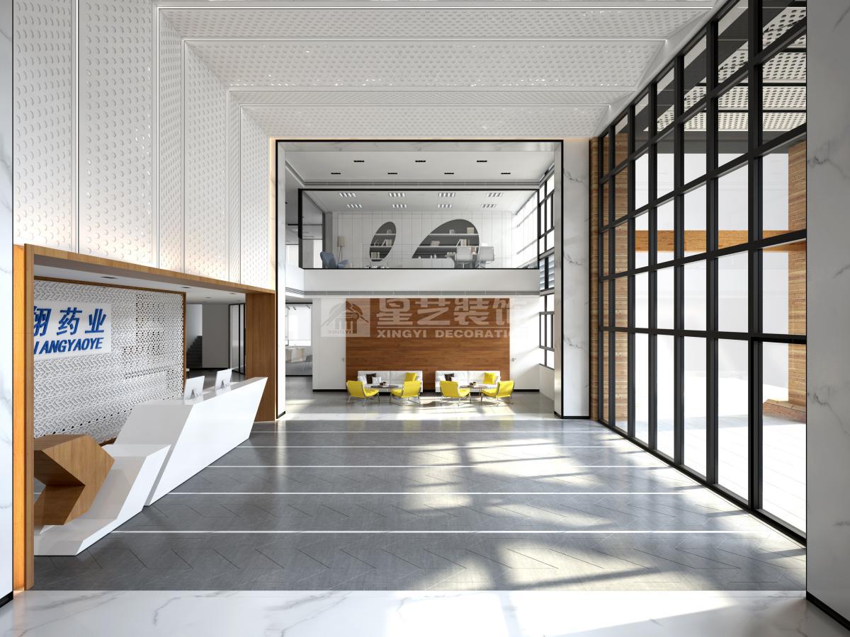 本案设计一栋办公楼设计,设计面积为2000多平方米,区域有一层公共区,二层办公区,三层董事长办公区。整体设计是以现代简约风格设计,设计元素是以键翔药业企业的形象主色调和LOGO进行创作,前台办公台的设计灵感来源于该企业的LOGO。地面的拼花的设计灵感也是源于它的LOGO形状,并且地面设计是对应着天花的形状,天花是采用铝板冲孔暗藏灯带出光,具有很强烈的现代时尚感。董事长办公室区域则是采用新中式成熟稳重的设计风格,在中式的设计风格里面采用一些简约的设计造型呼应整个办公楼的简约现代风格。