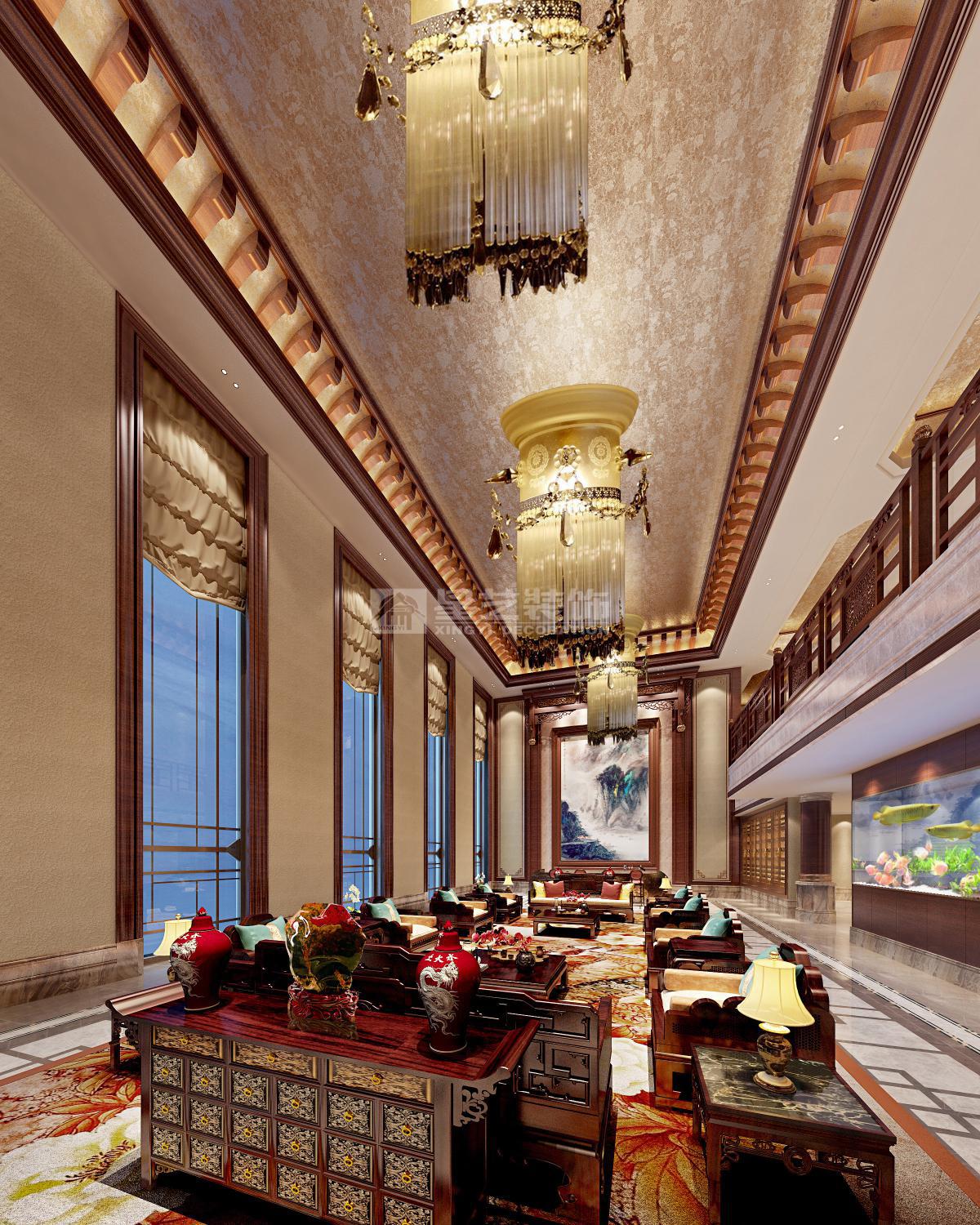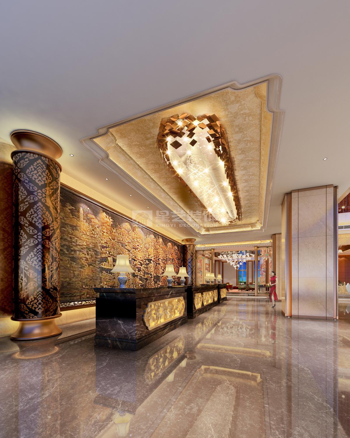 本案是奢华中式的设计风格,面积约为20000平方米的五星级国际酒店。本案的设计元素取决于该酒店附近的凤凰山,酒店大堂设计中间位是以凤凰图案的实木雕刻艺术品主背景,中间的两条柱子是以莲花的形状来设计。左右两侧的背景墙是以卷轴的形式设计浮雕的中式图案。