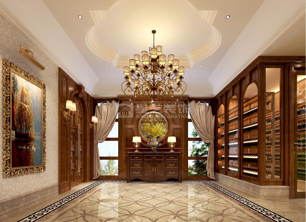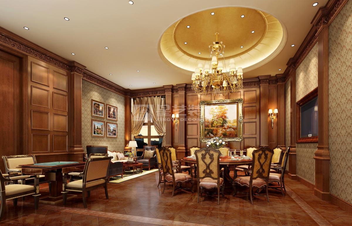 本案设计是迎海茶都会所,总共有两层,一层为办公区域,二层为会所接待区域,设计面积为2000多平方米。设计风格是美式会所风格。设计上运用了很多欧式线条和木饰面护墙板设计。里面有办公区域,董事长办公室,接待区域,红酒区域,红酒酒窖区域,中餐包房区域,室内高尔夫球区域,娱乐区域,KTV区域等等,多功能会所设计。