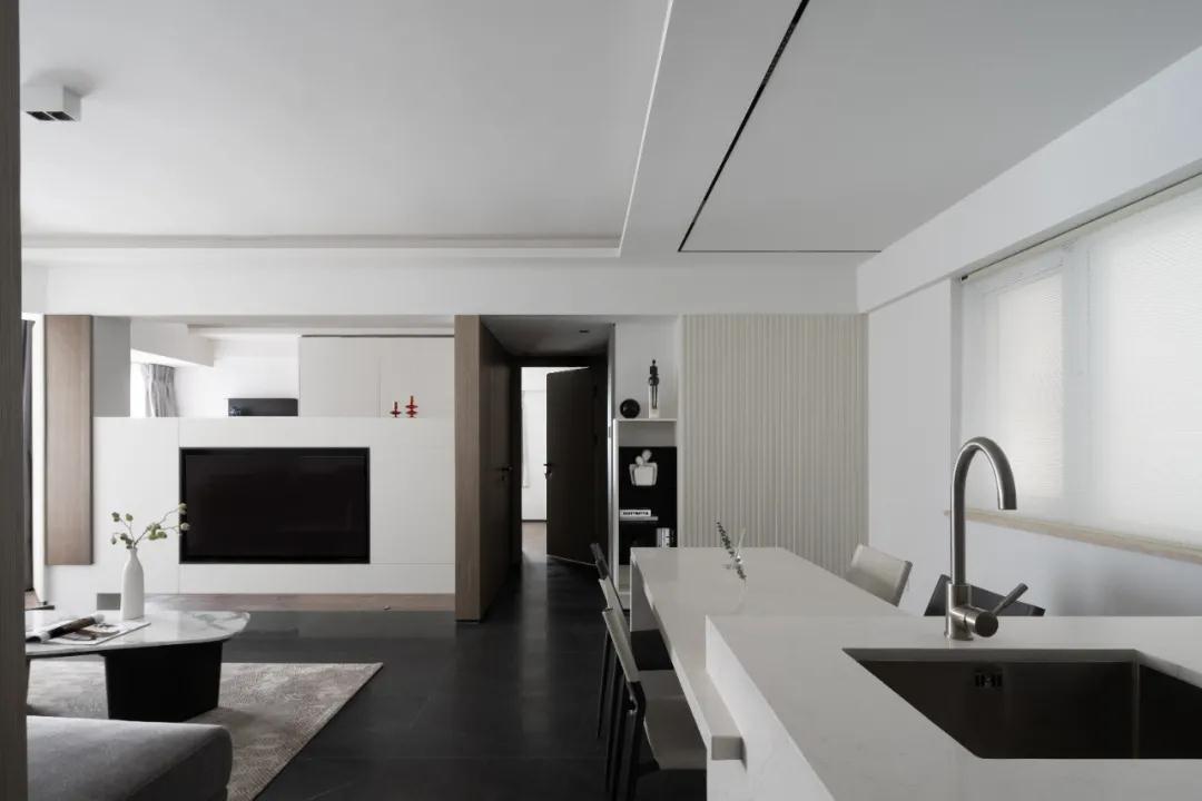 在承载了重要生活场景的餐厨区域,设计师直接把玻璃门和墙体打掉之后,开放式厨房搭配岛台设计,将整个餐厨空间融为一体,显得通透、明亮。通过轻松简约的造型与黑白灰的色调来呈现空间里的都市感。