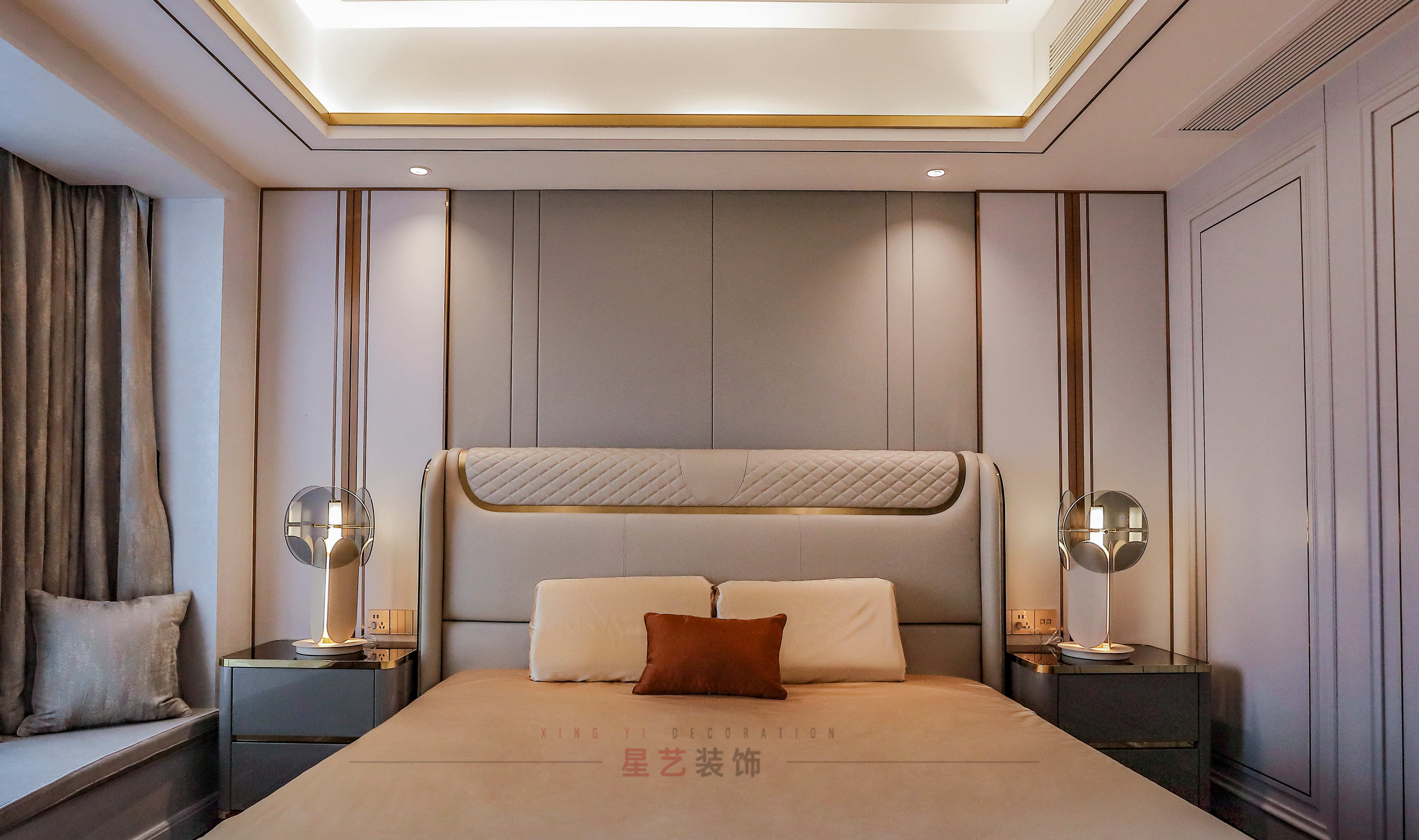 效果图和实景图中的主卧都用了大量的对称元素,墙面,衣柜和天花板都有用到对称的手法,效果图整体色调偏向黑白灰,用橘色做点缀,简约又不平凡。