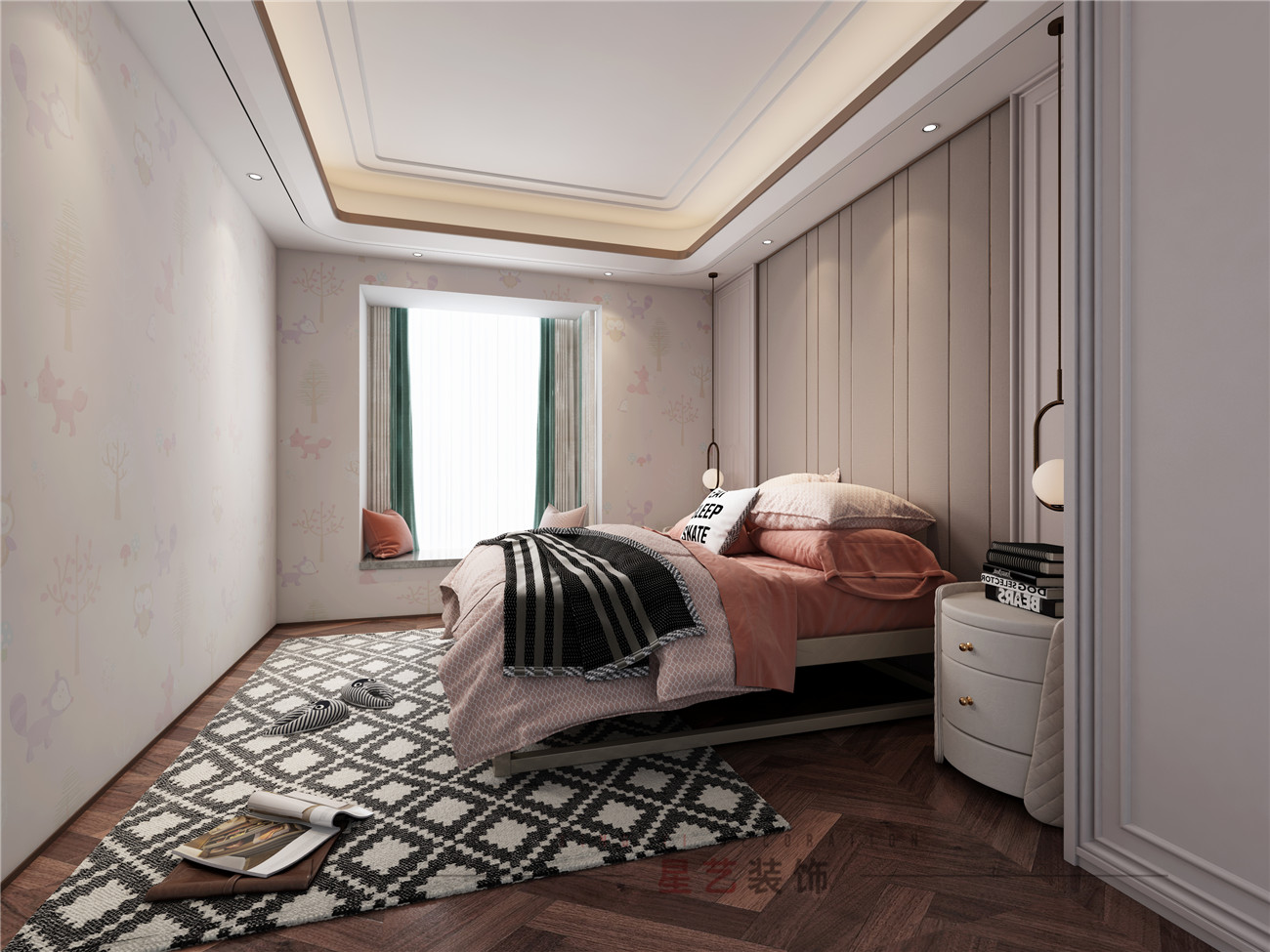 效果图中的男孩用了大量的黑白灰设计,也是男孩子普遍比较喜欢的简约设计,稍微有些凌乱的摆放也增添了生活的气息。女孩房的效果图中给人感觉非常温馨舒适,墙上得狐狸图案也显得活泼俏皮。