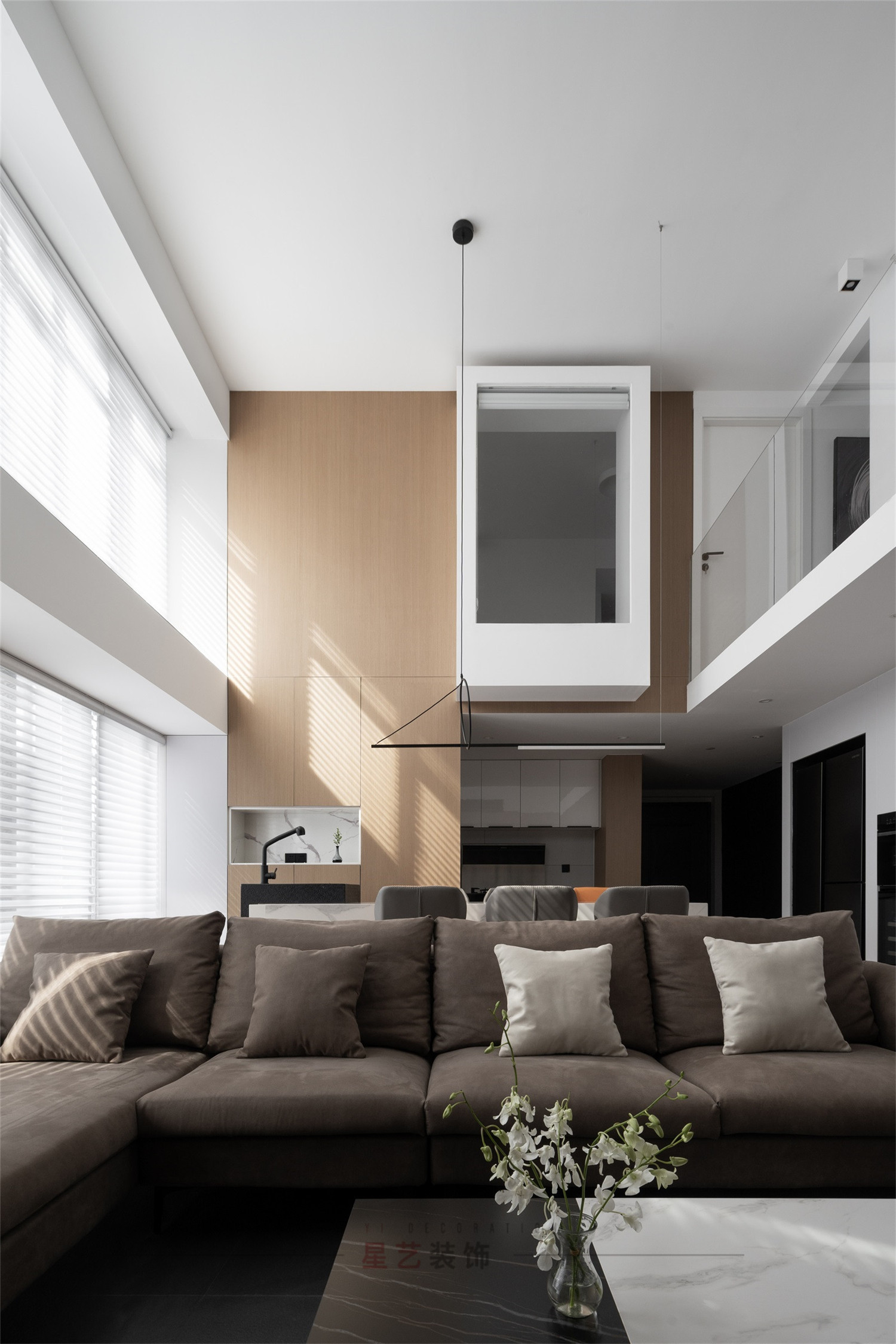 从二楼俯瞰视角就能明显的发现,客厅的整体的设计非常灵活,根据时间变化的光影效果能营造出各种美轮美奂的梦幻空间。