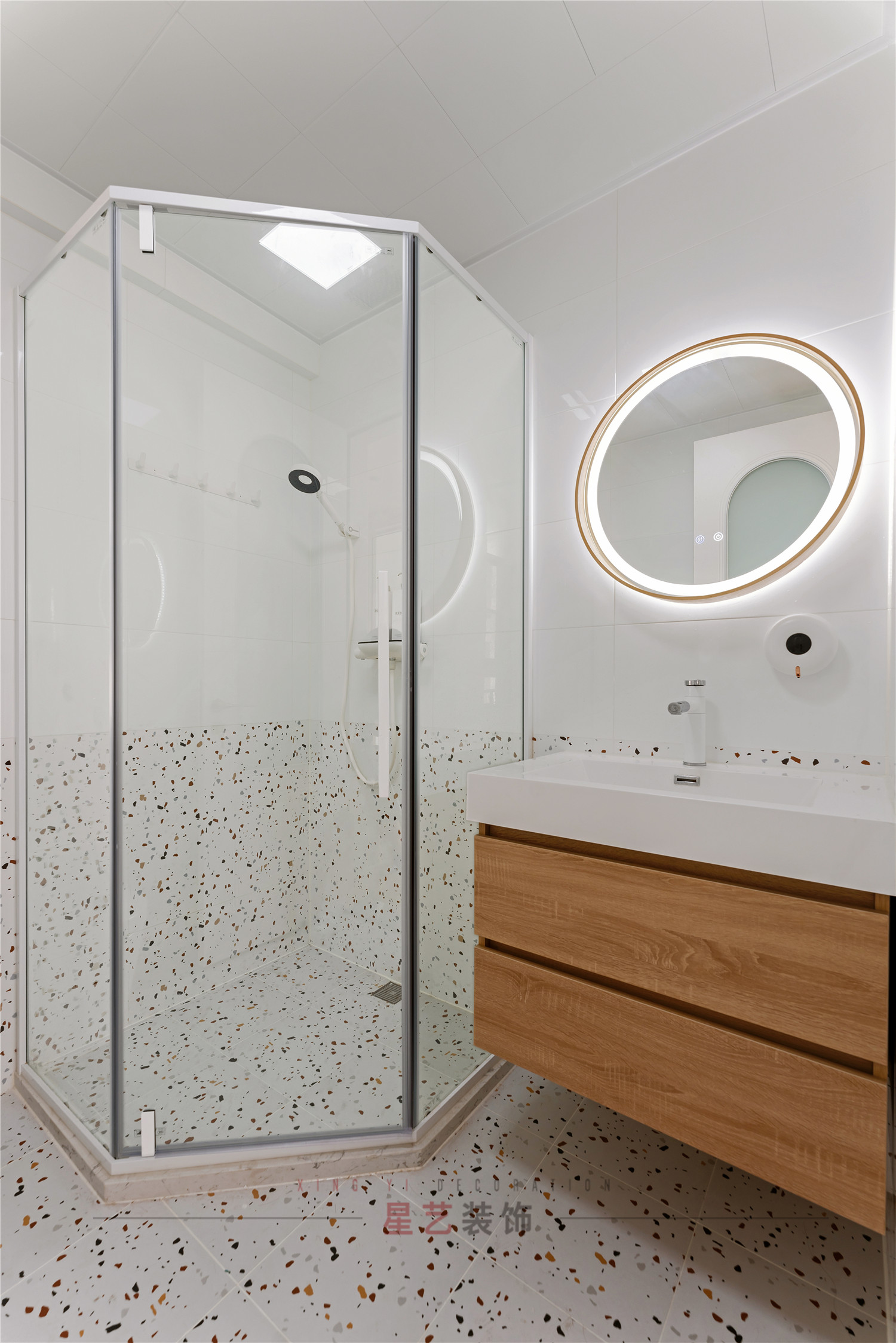 简约却不简单的淋浴房一半都用彩色斑点瓷砖做铺垫,与干湿分离的梯形区域和圆形的发光境结合,呈现出干净有格调的轻奢感。