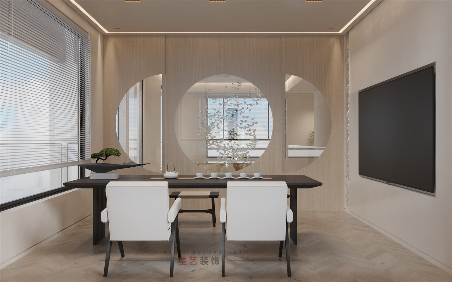 过道处设有卫生间,洗手台,便捷舒适。墙体与玻璃门都有运用大面积枯山水纹路,诠释深刻的禅宗美学,从而实现“无水而喻水”的效果,强化细节体现。