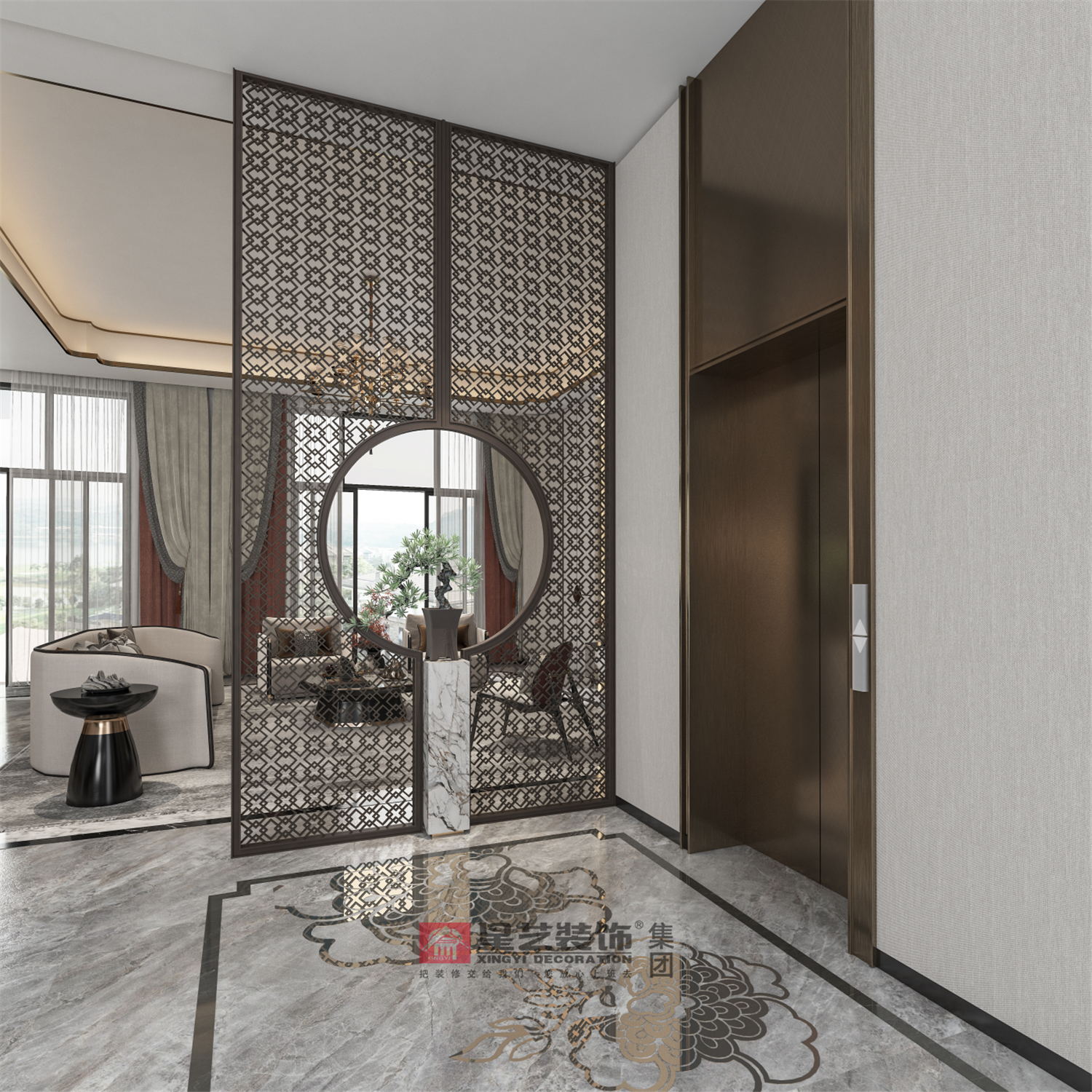 地面采用女主人喜欢的银杏叶与祥云元素,配上隔断屏风隔而不断,即起到风水上的挡煞作用。并以石材原木与金属为主要材质,把东方气韵下的低调典雅呈现的淋漓尽致。
